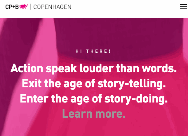 Cinemagraphs — high-quality videos or GIFs that run on a smooth, continuous loop — have become a popular way to add movement and visual interest to otherwise static pages. Full-screen loops, like this example from Danish agency CP+B Copenhagen, create immediate interest on an otherwise simple page.