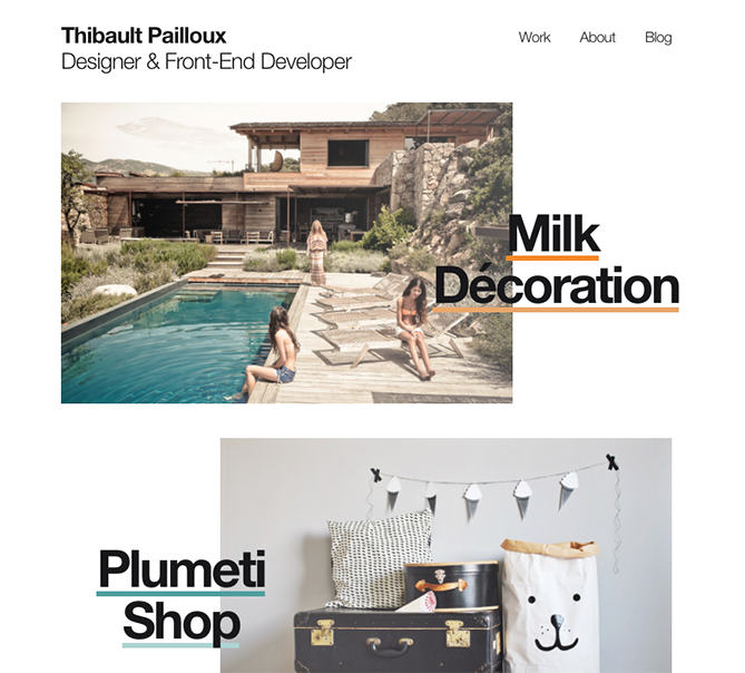 Text that slightly overlaps accompanying images has become a popular effect for blogs and portfolios. Freelance art director and front-end developer Thibault Pailloux makes his overlapping text stand out with a colorful underline beneath each title.