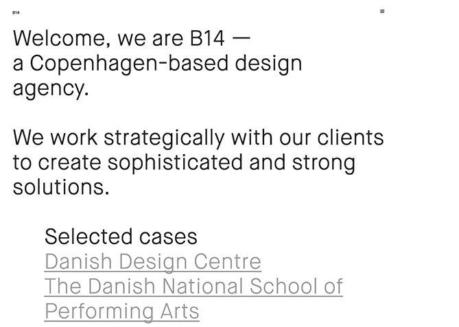 Danish agency B14 uses their homepage real estate to simply describe their mission statement and provide links to samples of their work. It’s a modern, uncluttered approach to presenting information.
