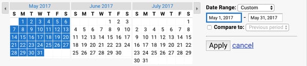 Go back to GA. Change the date range to the most recent fully completed month (i.e. if you’re doing this on October 30, the date range would be September 1, 2017 – September 30, 2017.)