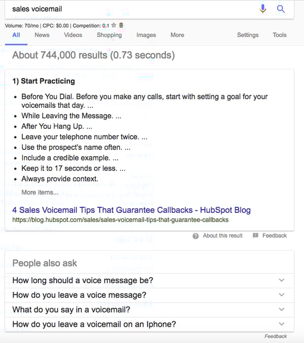 Find the highest-volume keyword the post is ranking in the top five for. It should be fairly general; for example, in September 2017, “40 Sales Interview Questions to Recruit the Best Reps in 2017” ranked #2 for “sales interview questions.”